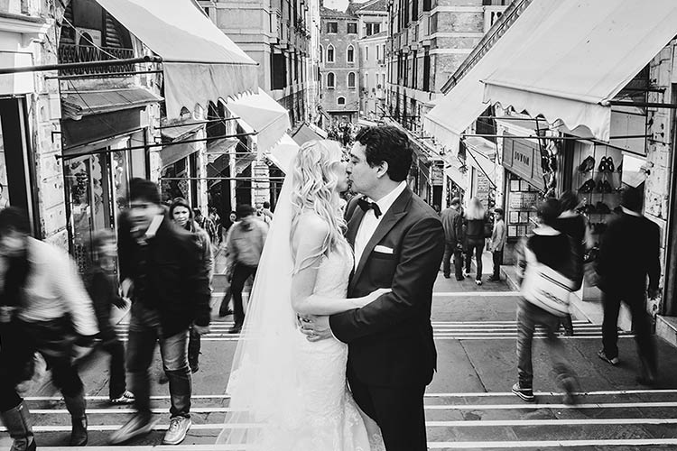 After the ceremony Rebecca and Alireza continued to walk in the city. They stopped at Rialto Bridge. Photographer took for them a photo with beautiful staircase and the ancient shops as background.