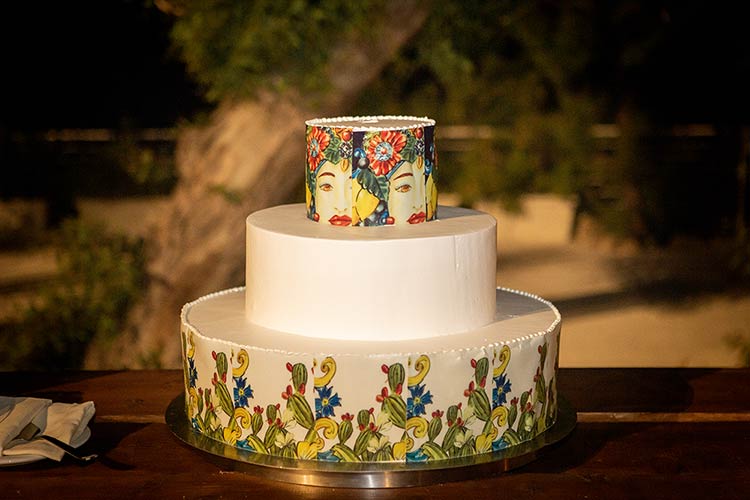 Under a starry sky wedding reception dinner began with a large welcome buffet made of traditional Sicilian dishes. Cutting of the cake moment was really appreciated by all guests. A large natural wooden table in front of olive trees made the atmosphere just magic. Bride and groom really enjoyed every single second and every single picture in front of this large cake decorated with traditional Sicilian designs.